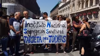 Tras presentar el informe ante el INSS y explicar casos concretos de personas afectadas por esta situación, medio centenar de miembros de Yo Si Sanidad Universal han protestado por la situación con una pancarta con el lema 'Instituto Nacional de Segregación Sanitaria. Tarjeta para Todos' y cánticos como "Mariano, Mariano, segregar es insano" o "No es sanidad si no es universal, por mucho que lo diga la Seguridad Social".