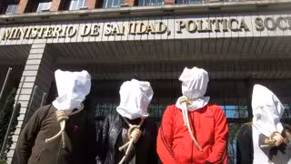 Representantes de la Coordinadora Estatal del VIH/sida, CESIDA, han protestado este miércoles frente al Ministerio de Sanidad, Servicios Sociales e Igualdad por los recortes que están "asfixiando" a muchos de estos pacientes, especialmente en el caso de los inmigrantes en situación irregular, al limitar su acceso a los tratamientos. Para escenificar su protesta, han ido encapuchados con sogas en el cuello, vestidos de presos condenados a muerte.