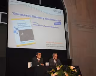 Los coordinadores de esta obra, el doctor Román Alberca Serrano, ex jefe de Servicio del Departamento de Neurología del Hospital Universitario Virgen del Rocío de Sevilla, y el doctor Secundino López-Pousa, jefe del Servicio de Neurociencias Clínicas han presentado la cuarta edición revisada de esta obra.