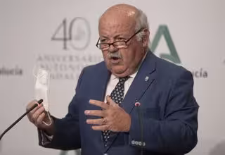 El consejero de Salud y Familias de la Junta de Andalucía, Jesús Aguirre, ha descartado este lunes una posible relajación del uso obligatorio de la mascarilla en espacios abiertos como la que está planteando Castilla-La Mancha y ha incidido en que este elemento es "lo que más nos previene aparte de la vacuna" frente a la Covid-19.