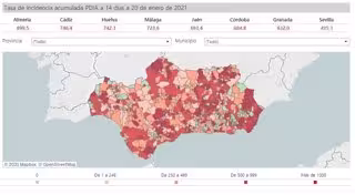 Andalucía registra este miércoles 20 de enero otros 39 municipios con tasa de incidencia del coronavirus Covid-19 superior a los 500 casos por cada 100.000 habitantes en los últimos 14 días que la Junta ha fijado como criterio para decretar el cierre perimetral, que se suman a los 326 en los que esta medida restrictiva ya ha entrado en vigor.