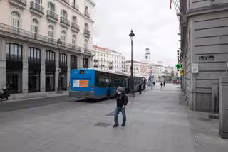 Una persona con mascarilla anda por la calle Calle Alcalá junto a la turística Puerta del Sol madrileña vacía durante el estado de alarma decretado por el coronavirus, en Madrid (España), a 16 de marzo de 2020. - Joaquin Corchero / Europa Press