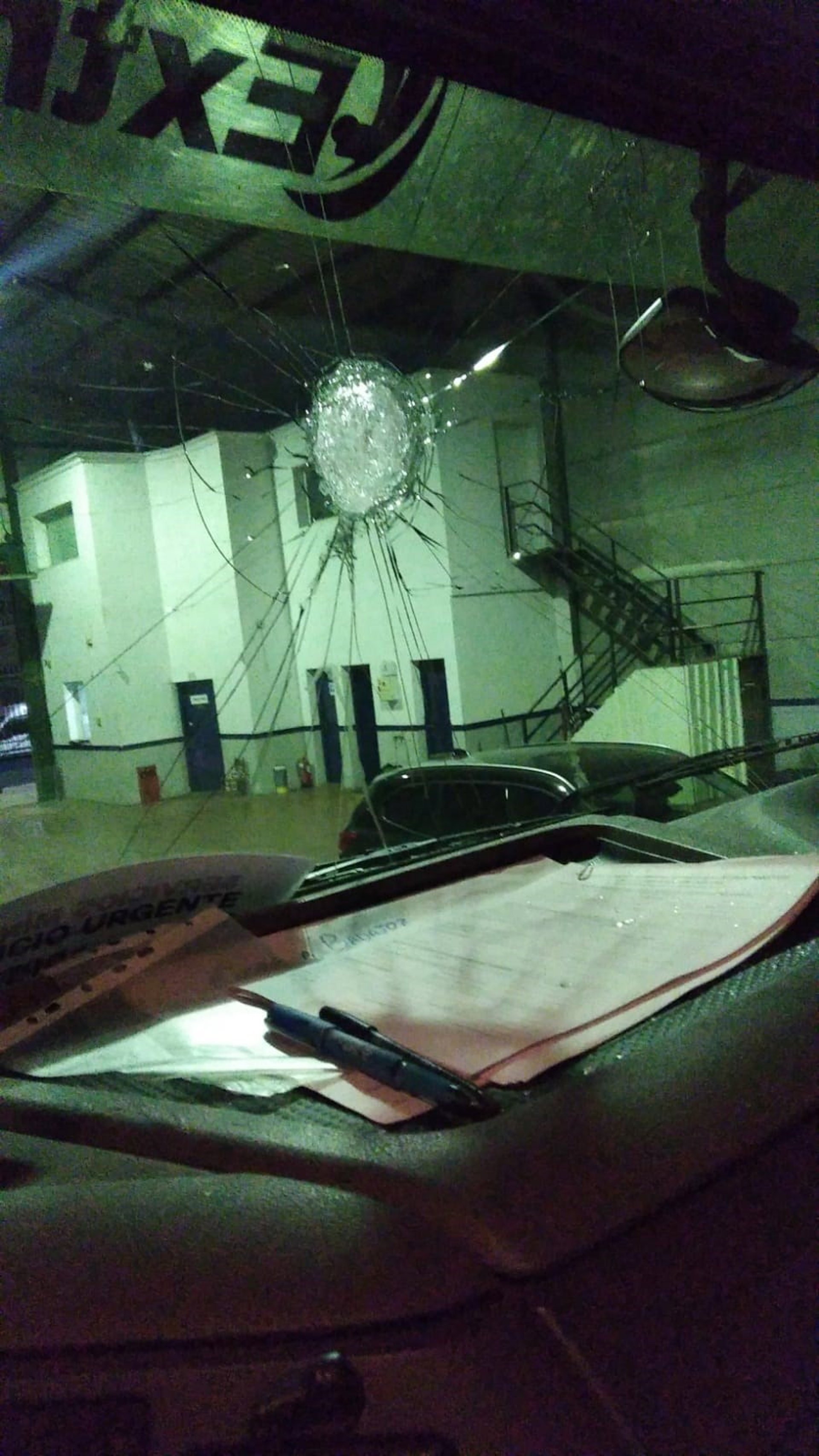 Como consecuencia, han sido alcanzadas las lunas, la máquina de refrigeración que llevan las furgonetas en techo para mantener la cabina por debajo de 25C, la visera cortaviento y ha sufrido desperfectos en la chapa.