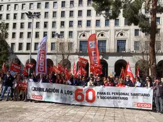 La Federación de Sanidad y Sectores Sociosanitarios de CCOO (FSS-CCOO) se ha concentrado, en la mañana de este martes, a las puertas del Ministerio de Seguridad Social para exigir al ministro José Luis Escrivá que se inicie el procedimiento para reducir le edad de jubilación a los 60 años para el personal sanitario y sociosanitario.