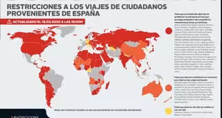 Los países que prohíben la entrada de españoles o han suspendido las comunicaciones aéreas y/o marítimas son Albania, Angola, Arabia Saudí, Argelia, Argentina, Armenia, Austria, Bahamas, Bangladesh, Bolivia, Bosnia-Herzegovina, Bulgaria, Camboya, Camerún, Canadá, Chad, Chile, Chipre, Colombia, Costa de Marfil, Costa Rica, Dinamarca, Ecuador, Egipto, Emiratos Árabes Unidos y El Salvador.