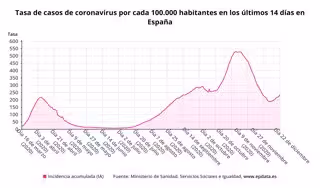 La incidencia media actual de contagios en España en los últimos 14 días sigue aumentando, situándose en los 236,27 casos por cada 100.000 habitantes, en comparación con los 224,88 notificado el lunes por el Ministerio de Sanidad.