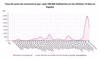 La cifra total de contagios en España se eleva ya a 10.502.141 desde el inicio de la pandemia, según las estadísticas oficiales. La incidencia acumulada en los últimos 14 días por 100.000 habitantes se sitúa en 1.692,52 frente a 1.893,35 de ayer. En las pasadas dos semanas se ha registrado un total de 802.004 positivos.