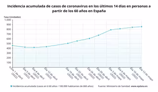 La cifra total de contagios en España se eleva ya a 12.127.122 desde el inicio de la pandemia, según las estadísticas oficiales. La incidencia en mayores de 60 años se sitúa en 856,56 en los últimos 14 días por 100.000, frente a 843,24 el martes. En las pasadas dos semanas se ha registrado un total de 105.512 positivos en este grupo de edad.