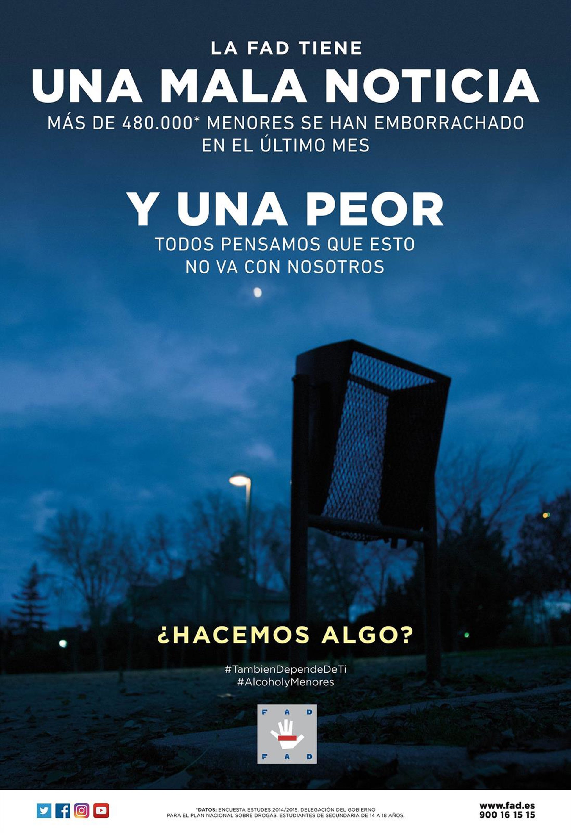 "La FAD tiene una mala noticia y una peor. La mala: más de 480.000 menores se han emborrachado en el último mes. La peor: que todos pensamos que esto no va con nosotros. El problema con el alcohol en menores es que no vemos que sea nuestro problema ¿hacemos algo?", plantea la acción de concienciación que incluye un spot para televisión de 20 segundos de duración, una cuña para la radio y una gráfica para prensa, y publicidad exterior.