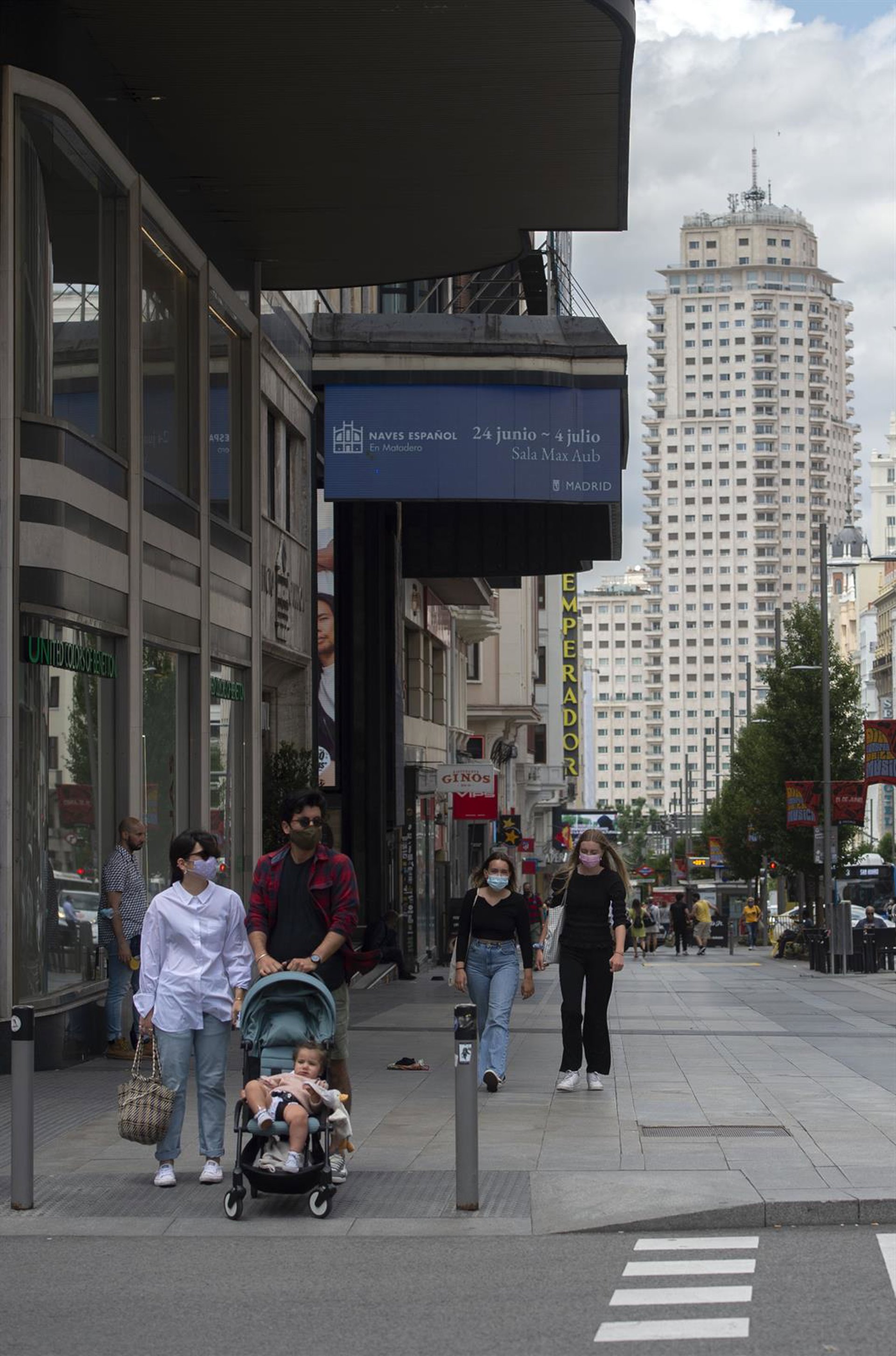 Varias personas caminan por la Gran Vía con mascarilla, a 18 de junio de 2021, en Madrid (España). El presidente del Gobierno, Pedro Sánchez, ha anunciado que las mascarillas dejarán de ser obligatorias en los espacios al aire libre a partir del próximo - Alberto Ortega - Europa Press