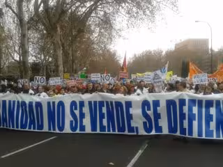 Miles de profesionales sanitarios se están manifestando este mediodía en el centro de Madrid en defensa de la Sanidad pública y en contra de las recientes reformas promovidas por la Comunidad de Madrid, que culminaron el pasado 27 de diciembre con la aprobación de la Ley de Medidas Fiscales que permiten ampliar la externalización de la gestión sanitaria.