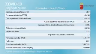 De los 387 nuevos casos, 113 corresponden al municipio de Murcia, 76 a Lorca, 42 a Totana, 30 a Cartagena, 15 a Fuente Álamo, 13 a Jumilla, 12 a Fortuna, 10 a Molina de Segura, 10 a Santomera, 8 a Alcantarilla, 8 a Puerto Lumbreras, 6 a Archena, 5 a Alhama de Murcia, y 5 a Cieza, . El resto están repartidos entre diversas localidades.