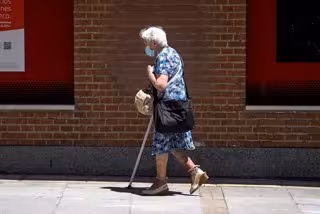 Una anciana con mascarilla camina por la calle ayudada de una muleta, a 27 de julio de 2021, en Madrid, (España). - A. Pérez Meca - Europa Press