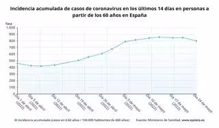 Respecto a la incidencia media actual de contagios en España en los últimos 14 días en personas mayores de 60 años, el informe muestra descenso de casi 50 puntos, situándose en los 800,47 casos por cada 100.000 habitantes, en comparación con los 848,62 notificado el pasado viernes por el departamento dirigido por Carolina Darias. En las pasadas dos semanas se ha registrado un total de 98.603 positivos en este grupo de edad.