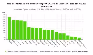 La cifra total de contagios en España se eleva ya a 3.435.840 desde el inicio de la pandemia, según las estadísticas oficiales. La incidencia acumulada en los últimos 14 días por 100.000 habitantes se sitúa en 230,95, frente a 230,54 ayer. En las pasadas dos semanas se ha registrado un total de 109.586 positivos.