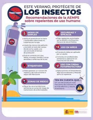La Agencia Española de Medicamentos y Productos Sanitarios (AEMPS) ha publicado sus recomendaciones para una correcta identificación y buen uso de los productos repelentes de uso humano.