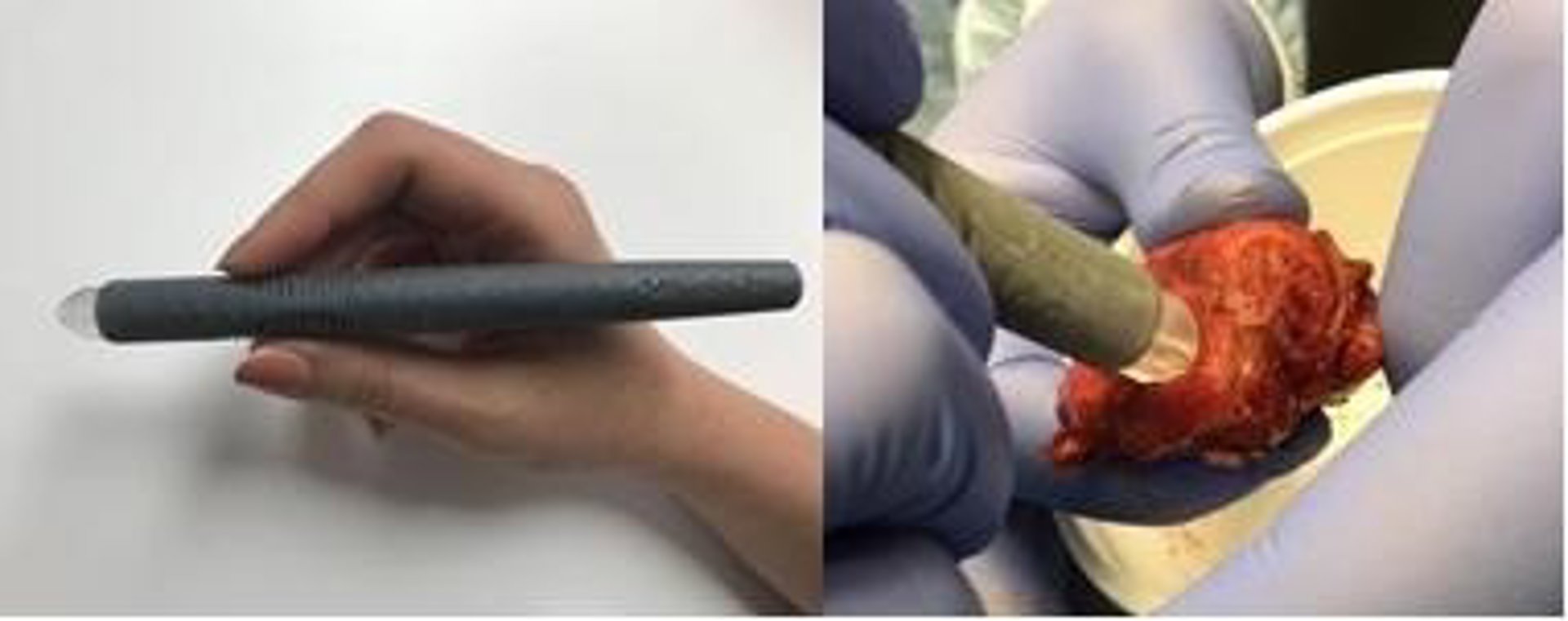 La pluma MasSpec (izquierda) podría algún día ayudar a los cirujanos de cáncer a determinar los bordes de los tumores en la sala de operaciones. - LABORATORIO EBERLIN / UNIVERSIDAD DE TEXAS EN AUST