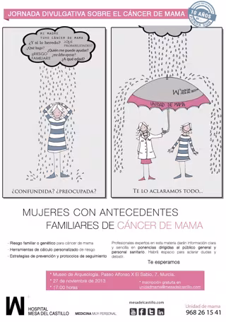 El Hospital Mesa del Castillo, a través de su Unidad de Mama, quiere ofrecer a todas las mujeres que sufren esta situación un encuentro donde especialistas tratarán los puntos más importantes a tener en cuenta si se tienen antecedentes familiares de esta enfermedad.