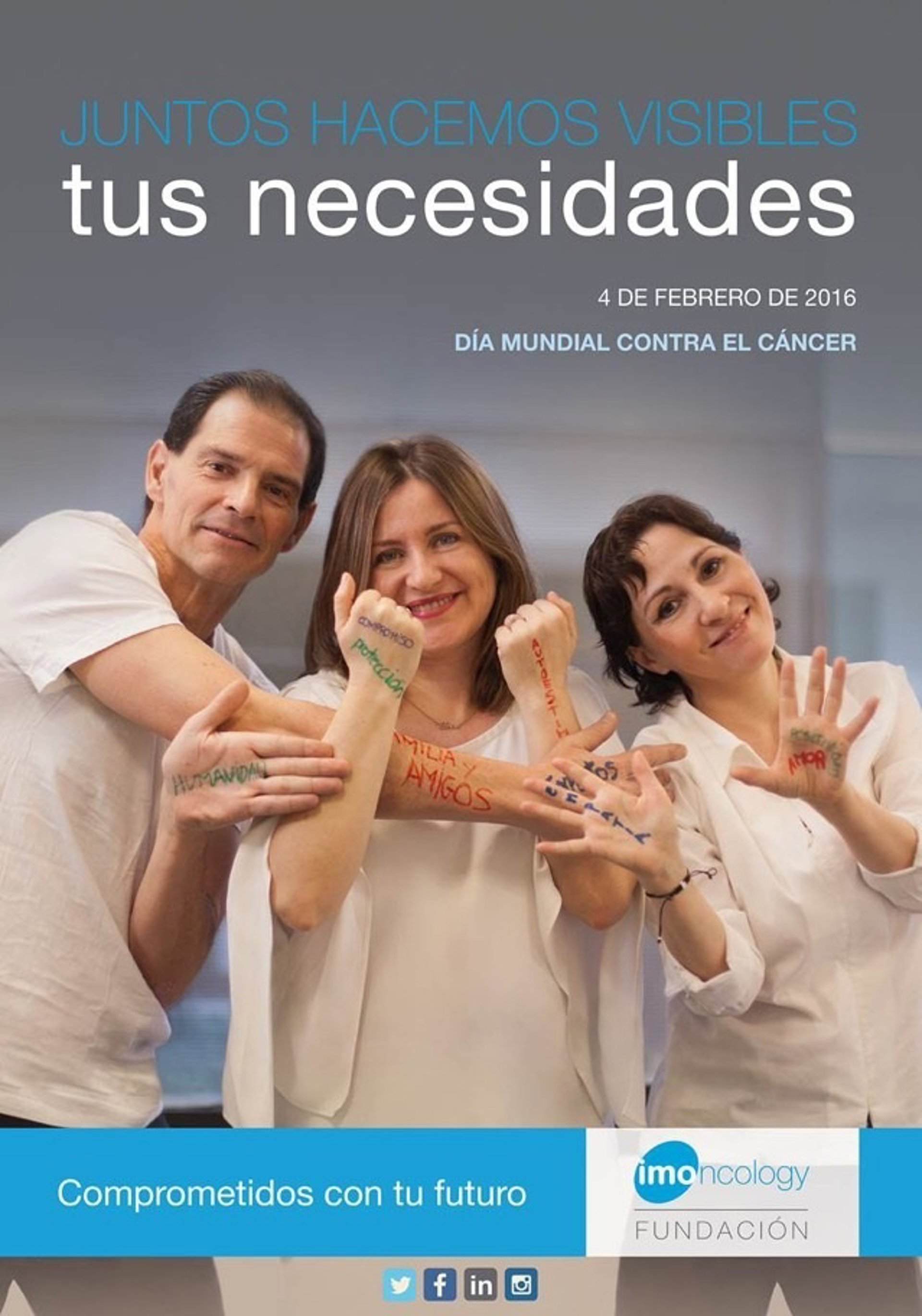IMOncology Fundación ha lanzado la campaña 'Juntos hacemos visibles tus necesidades', con motivo de la celebración, este jueves, del Día Mundial contra el Cáncer, para reclamar la cobertura de todas y cada una de las necesidades que durante y tras la enfermedad tienen los pacientes y supervivientes de cáncer.