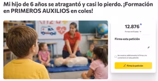 'Change.org' ha informado de que ya han sido recogidas más de 25.000 firmas en esta plataforma ciudadana pidiendo que los niños aprendan primeros auxilios desde el colegio, reclamo que ha sido impulsado por una madre cuyo hijo estuvo cerca de fallecer en enero a causa de un atragantamiento.