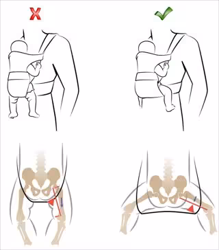 Asimismo, es importante que la barbilla esté separada del esternón para evitar riesgo de asfixia por bloqueo de vía aérea; la región abdominal del bebé esté en contacto con el cuerpo del adulto, nunca el costado o la espalda; la cara del bebé siempre tiene que estar visible; y que el adulto esté "muy pendiente" de que la boca y nariz no pegan contra el cuerpo del adulto y de que la respiración del bebé es rítmica.