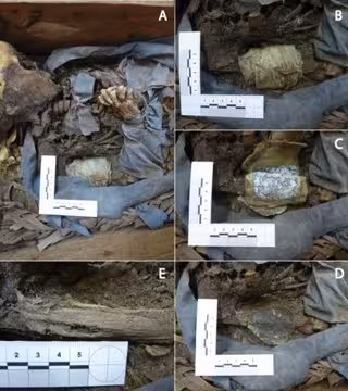 Dentro del féretro se encontró el cuerpo semi momificado de la niña, vestido con una capa azul y adornada con lazos azules, y dos especímenes de plantas: una hoja de hiedra y una rama de palma trenzada.