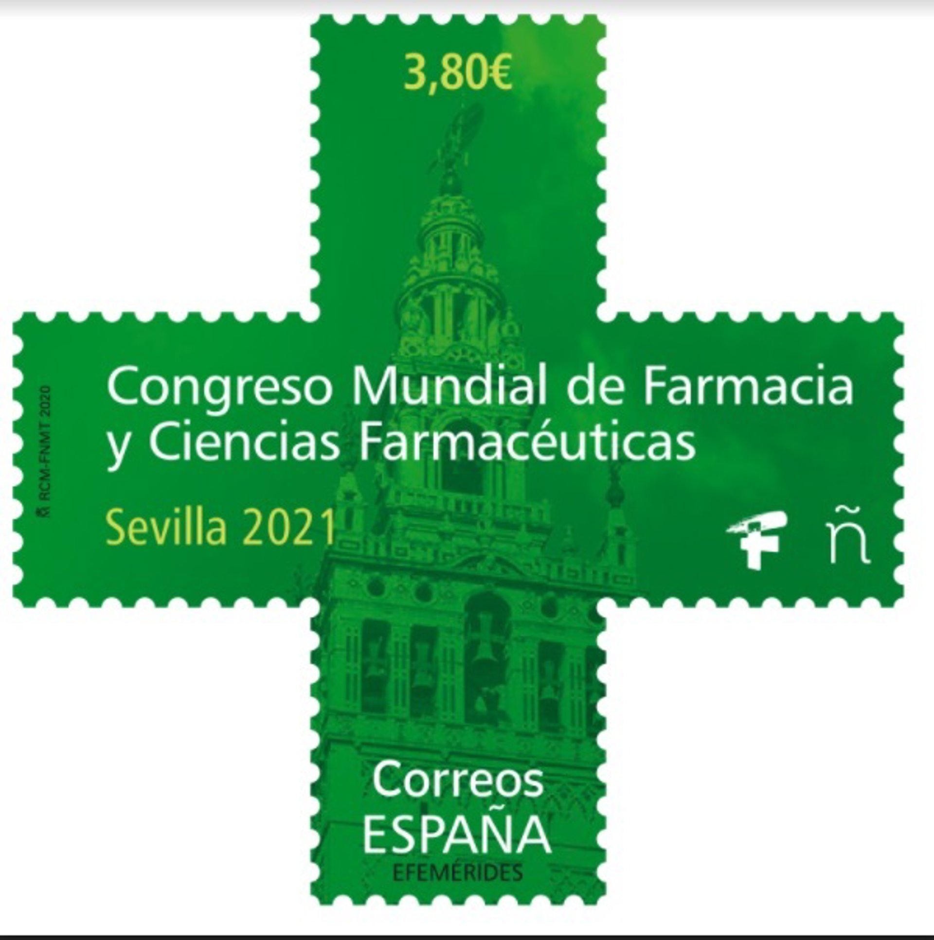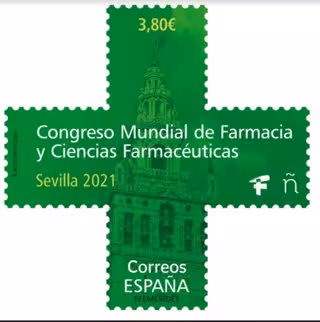 Correos ha emitido el sello con motivo de la celebración en Sevilla del Congreso Mundial de Farmacia y Ciencias Farmacéuticas, previsto para el mes de septiembre de este año que, a causa de la pandemia de la Covid-19, su celebración se ha aplazado a los días 12-16 de septiembre de 2021.