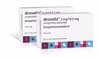 'Drovelis' está disponible en el mercado como presentación mensual con un blister de 28 comprimidos, 24 de color rosa que contienen principio activo y 4 de color blanco sin principio activo. Este régimen de administración se ha relacionado con una mayor supresión del desarrollo folicular y una mejoría del trastorno disfórico premenstrual.