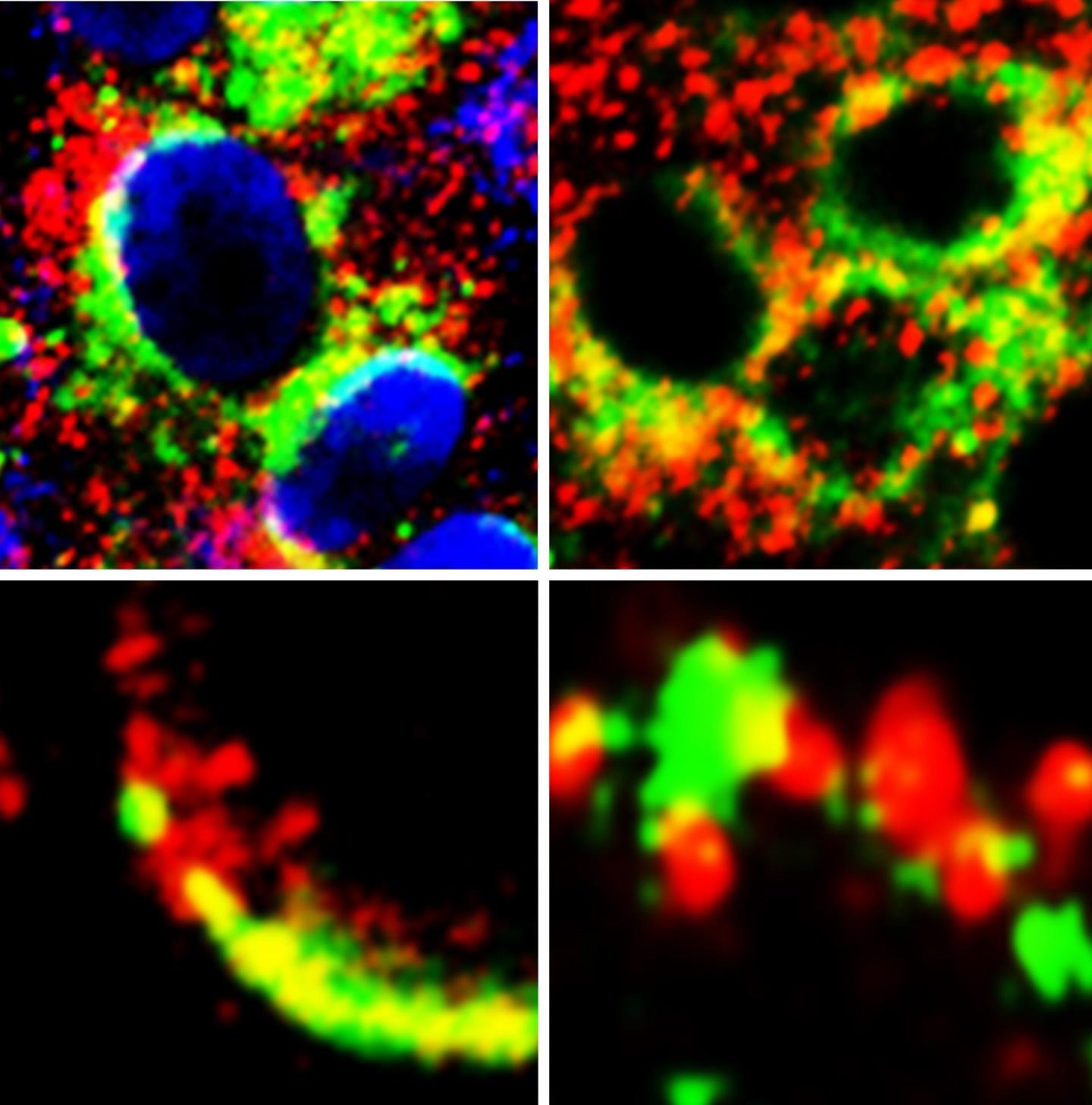 Imágenes de células que muestran la proximidad (amarillo) de GRP78 (verde) con la proteína Spike de SARS-Cov-2 (rojo) (paneles de la izquierda) y ACE2 (rojo) (paneles de la derecha). - ANTHONY CARLOS