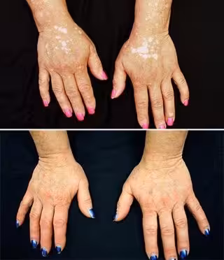 Durante dos meses de tratamiento, el paciente experimentó repigmentación parcial en la cara, los brazos y las manos. Tras cinco meses, las manchas blancas en la cara y las manos casi habían desaparecido, con sólo unos pocos puntos restantes en otras partes de su cuerpo. Notablemente, tofacitinib no causó efectos secundarios adversos durante el curso del tratamiento.