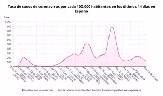 Respecto a la incidencia media actual de contagios en España en los últimos 14 días, el informe muestra que sigue reduciéndose, situándose en los 128,12 casos por cada 100.000 habitantes, en comparación con los 129,41 notificado ayer por el departamento dirigido por Carolina Darias.