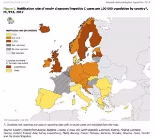 Dado que la hepatitis aguda es difícil de diagnosticar y la mayoría de los casos se identifican a través de prácticas de detección, es probable que la mayoría de los casos de hepatitis C clasificados como "desconocidos" (75%) sean infecciones crónicas. Además, según las encuestas de prevalencia, el ECDC estima que alrededor de 5,6 millones de europeos viven con hepatitis C crónica en Europa.