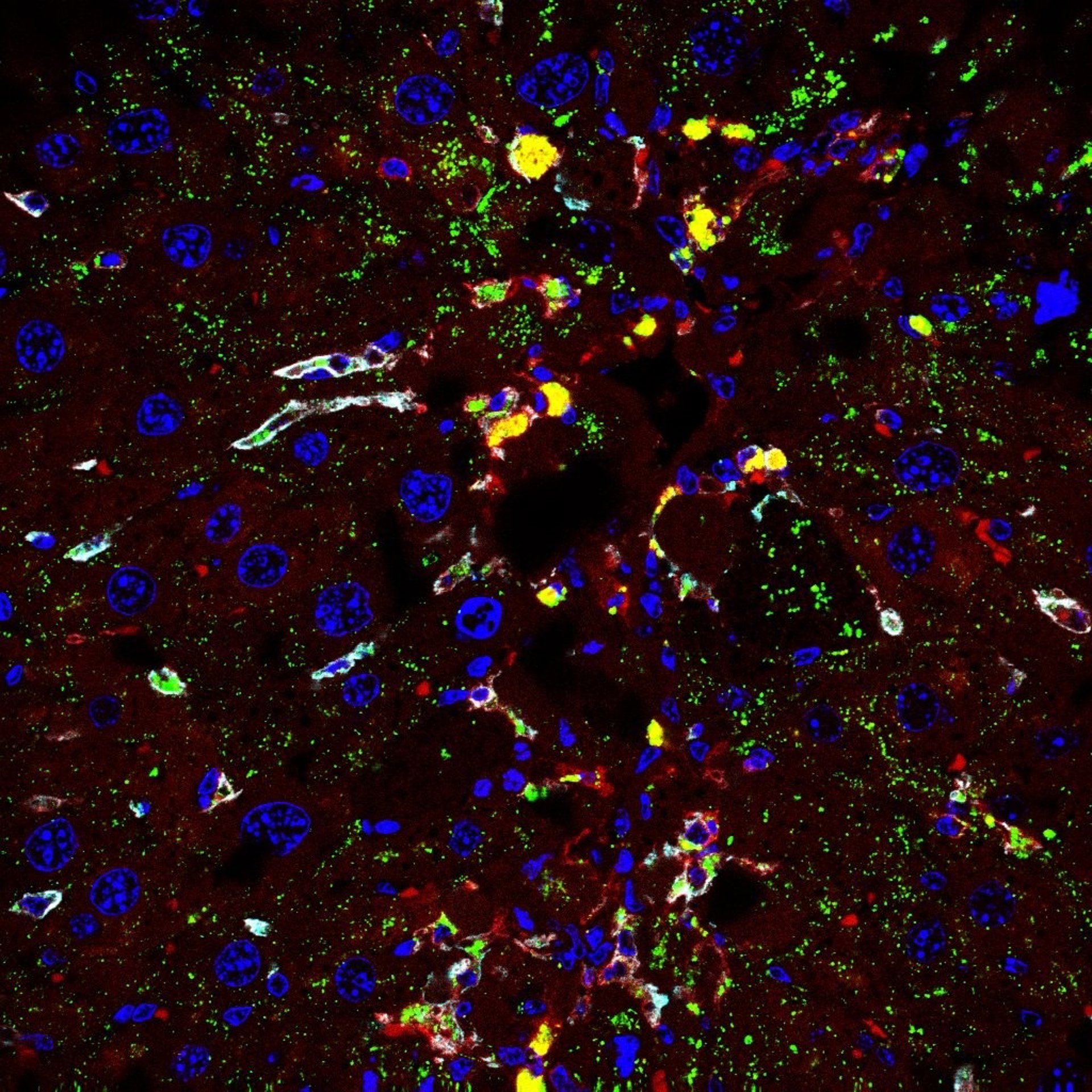 Archivo - Expresión de la catepsina D (verde) en poblaciones de macrófagos (azul y rojo) durante la fibrosis hepática. - MARÍA FERNÁNDEZ (IIBB-CSIC) - Archivo