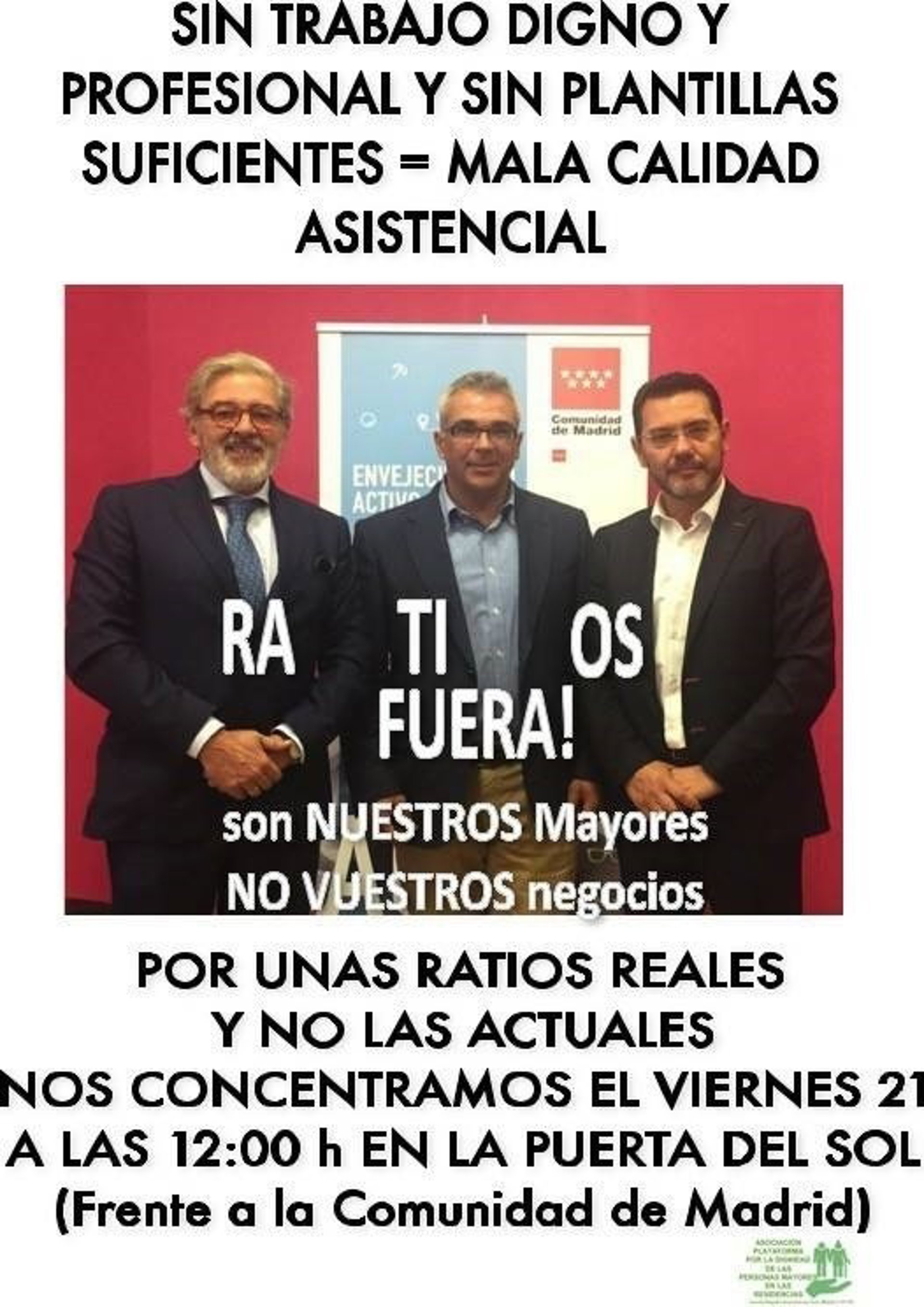 La Plataforma por la Dignidad de las Personas Mayores en las Residencias ha convocado una concentración este viernes, 21 de julio, a las 12 horas en Sol, frente a la Real Casa de Correos, sede del Gobierno de la Comunidad de Madrid, para reivindicar que la falta de enfermeros en las residencias conlleva "mala" calidad asistencial en los centros de mayores.