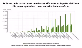 El Ministerio de Sanidad ha registrado este miércoles 11.190 casos de Covid-19, de los cuales 4.728 han sido diagnosticados en las últimas 24 horas, en comparación con los 3.022 del martes, lo que sitúa la cifra total de personas infectadas en España por coronavirus en las 614.360, a falta de los datos de Murcia que no ha podido actualizarlos.