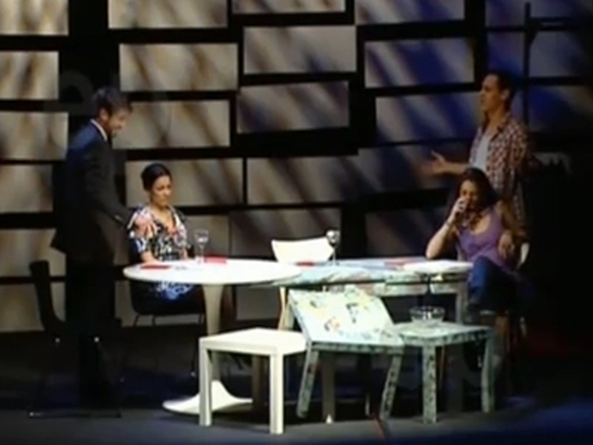 Los actores Félix Gómez, Ricard Sales y Cynthia Martín, que representan junto a Diana Palazón, la obra 'El día que nació Isaac" de Antonio Hernández, fuman en el escenario del Teatro Fernán Gómez de Madrid.