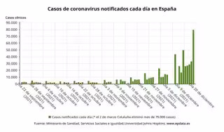 Las comunidades autónomas han notificado este lunes al Ministerio de Sanidad 79.704 nuevos casos de COVID-19, 9.993 de ellos diagnosticados en las últimas 24 horas. Estas cifras son muy superiores a las del mismo día de la semana pasada, cuando se notificaron 49.802 positivos, lo que evidencia la gran tendencia al alza en la evolución de la pandemia.