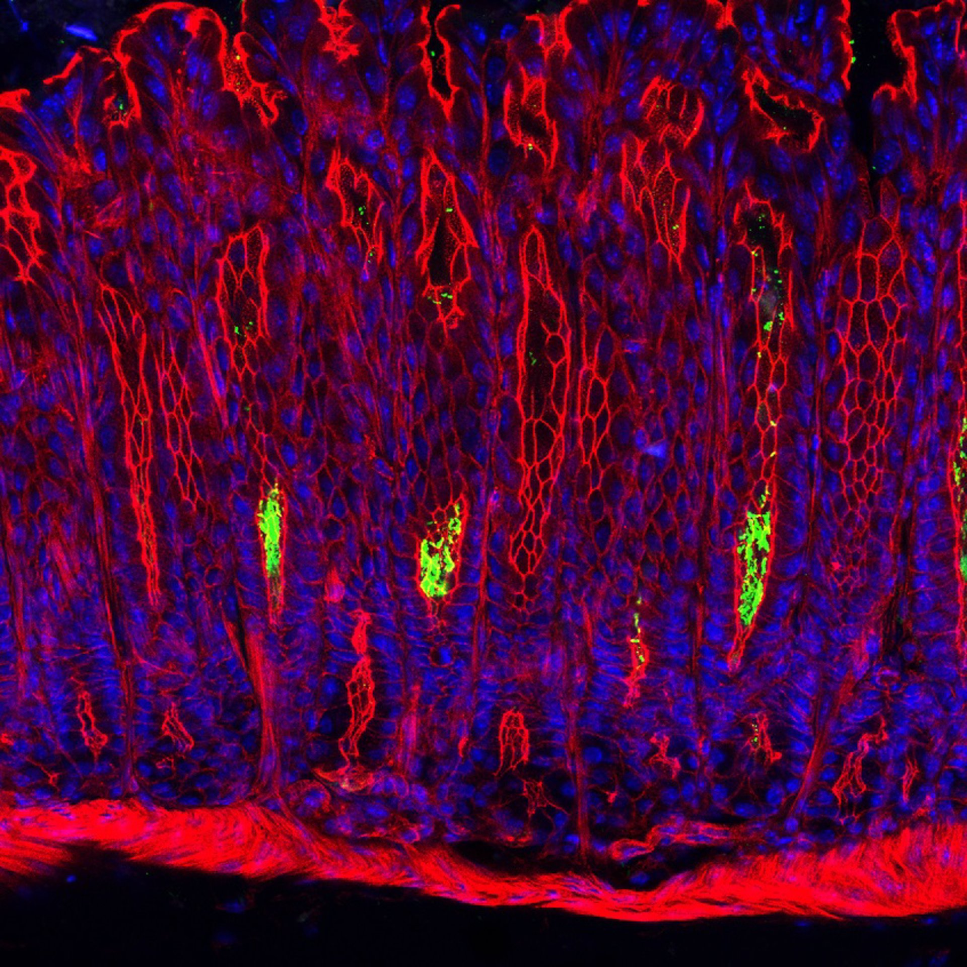 Archivo - Sección transversal a través de la mucosa gástrica de un ratón: La bacteria 'Helicobacter pylori' (verde) coloniza las cavidades de las glándulas gástricas. Los núcleos de las células de la membrana mucosa son en azul, citoesqueleto en rojo. - SIGAL/ CHARITÉ - Archivo