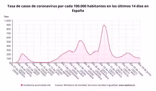 Respecto a la incidencia media actual de contagios en España en los últimos 14 días, el informe muestra que sigue reduciéndose, situándose en los 110,35 casos por cada 100.000 habitantes, en comparación con los 111,91 notificado ayer por el departamento dirigido por Carolina Darias.