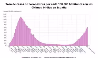 Asimismo, en los pasados siete días se han producido 1.407 ingresos hospitalarios (130.836 en el cómputo global de la pandemia): 179 en Andalucía, 212 en Aragón, tres en Asturias, 18 en Baleares, 78 en Canarias, 25 en Cantabria, diez en Castilla-La Mancha, 103 en Castilla y León, 72 en Cataluña, uno en Ceuta, 144 en Comunidad Valenciana, 18 en Extremadura, 72 en Galicia, 364 en Madrid, cuatro en Melilla, 57 en Murcia, 38 en Navarra y nueve en La Rioja.
