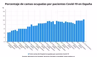 Actualmente, hay 12.945 pacientes ingresados por COVID-19 en toda España (11.784 el viernes) y 1.857 en UCI (1.768 el viernes), si bien en las últimas 24 horas se han producido 1.336 ingresos y 546 altas. La tasa de ocupación de camas ocupadas por coronavirus se sitúa ya en el 10,36 por ciento y en las UCI en el 21,04 por ciento.