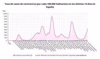 La cifra total de contagios en España se eleva ya a 5.393.268 desde el inicio de la pandemia, según las estadísticas oficiales. La incidencia acumulada en los últimos 14 días por 100.000 habitantes se sitúa en 441,69, frente a 412,26 ayer. En las pasadas dos semanas se ha registrado un total de 209.587 positivos.